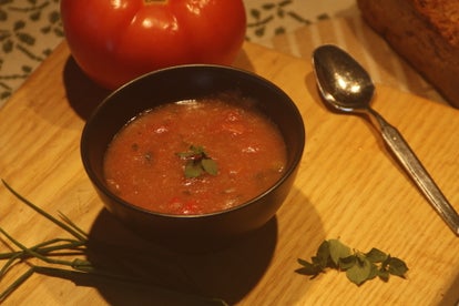 A rich tomato soup with carrots, capsicum, celery, potato and topped with spinach. Ready in 30 minutes with little work. You can add a dollop of cream as well!